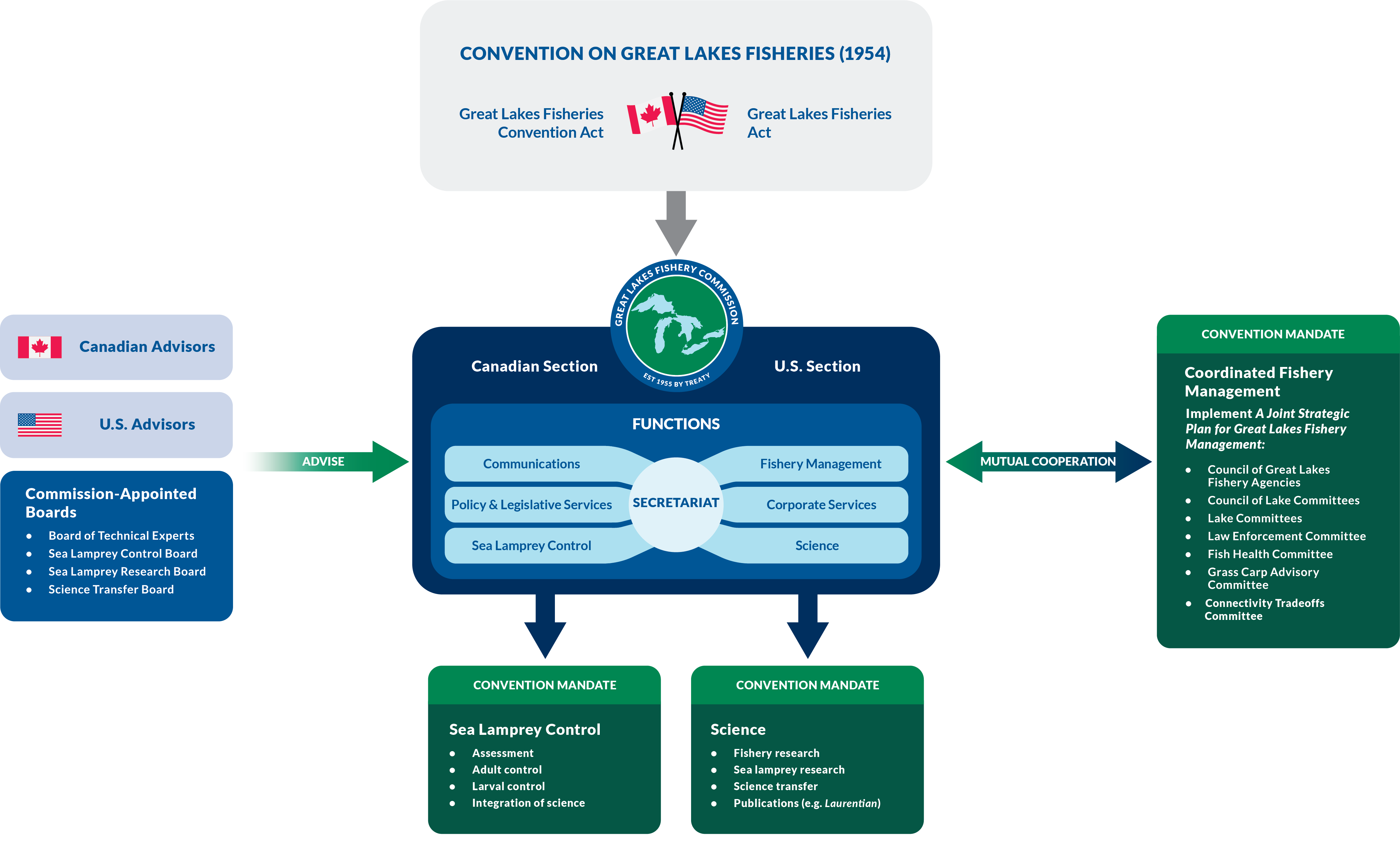 The 1954 Convention on Great Lakes Fisheries, which created the Great Lakes Fishery Commission, was born from a strong need to work together across borders not only to combat sea lampreys but also to promote science and establish working relationships among the players. The commission consists of four Canadian commissioners appointed by the Privy Council and four U.S. commissioners (plus one alternate) appointed by the President. The commissioners are supported by a secretariat, located in Ann Arbor, Michigan.