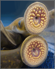 Sea lampreys attach to fish with a suction cup mouth, rasp a hole through the fish's scales and skin, and feed on the fish's body fluids. PHOTOS: T. LAWRENCE, GLFC (TOP); V. DZSURDZSA (BOTTOM)