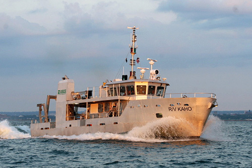 The R/V Kaho, based in Oswego, New York, was built in 2011 and currently operates on Lake Ontario. The new Kaho replaced the original R/V Kaho (built in 1961), which was the workhorse of the multiagency fisheries research fleet on Lake Ontario for more than three decades. The new Kaho participates in long-term data collections including population studies of prey fish and stocked lake trout, fish and environmental sampling for contaminants monitoring, and documentation of changes in food webs and fish distributions associated with invasive species. The name, "Kaho," is a shortened version of a colloquial Ojibwe word meaning "searcher" or "hunter". The Kaho can be at sea five days with sleeping accommodations for six people.
